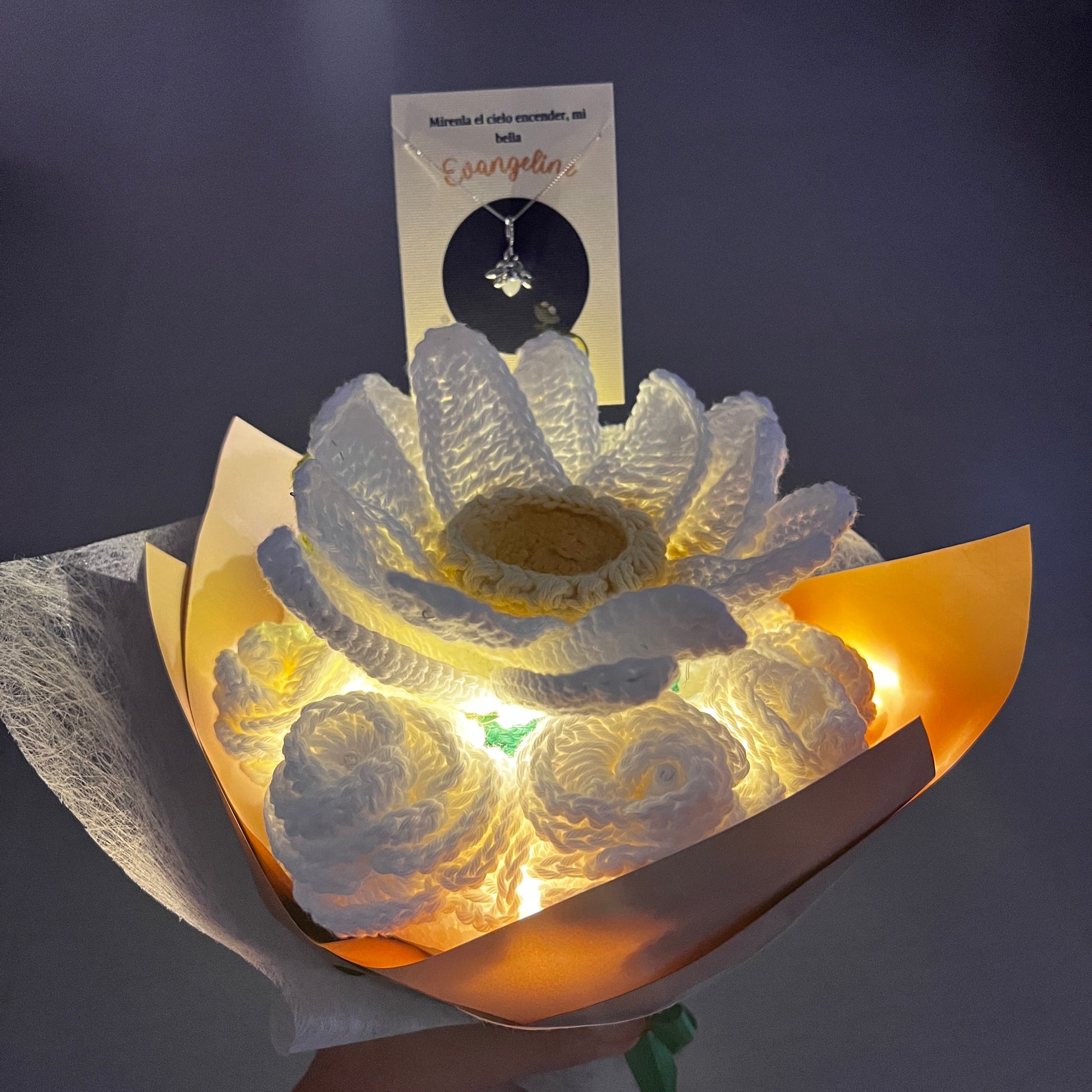 Bouquet de 10 rosas tejidas blancas con una flor de loto en el centro. Incluye luces en tonalidad cálida y una cadena evangeline de plata 925
