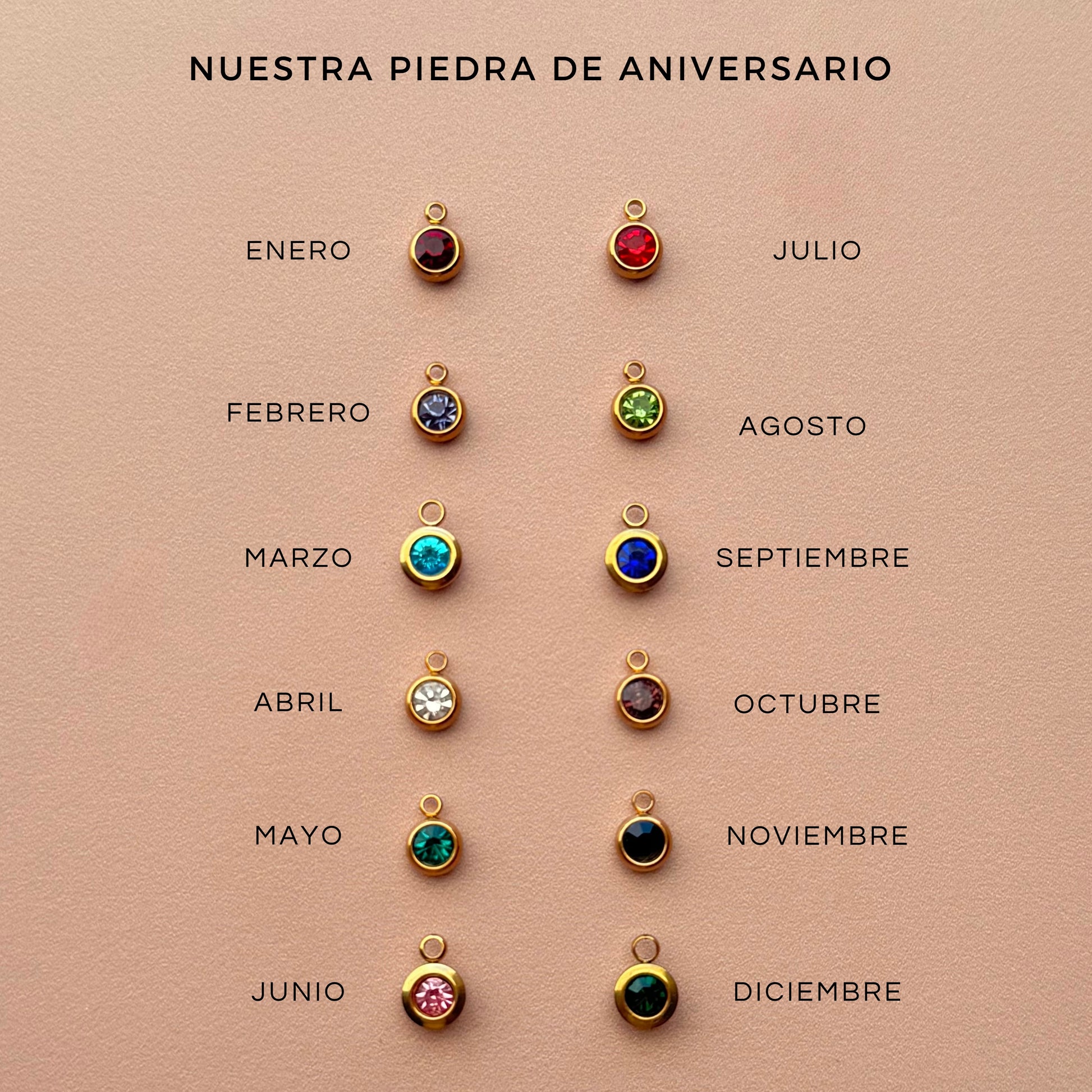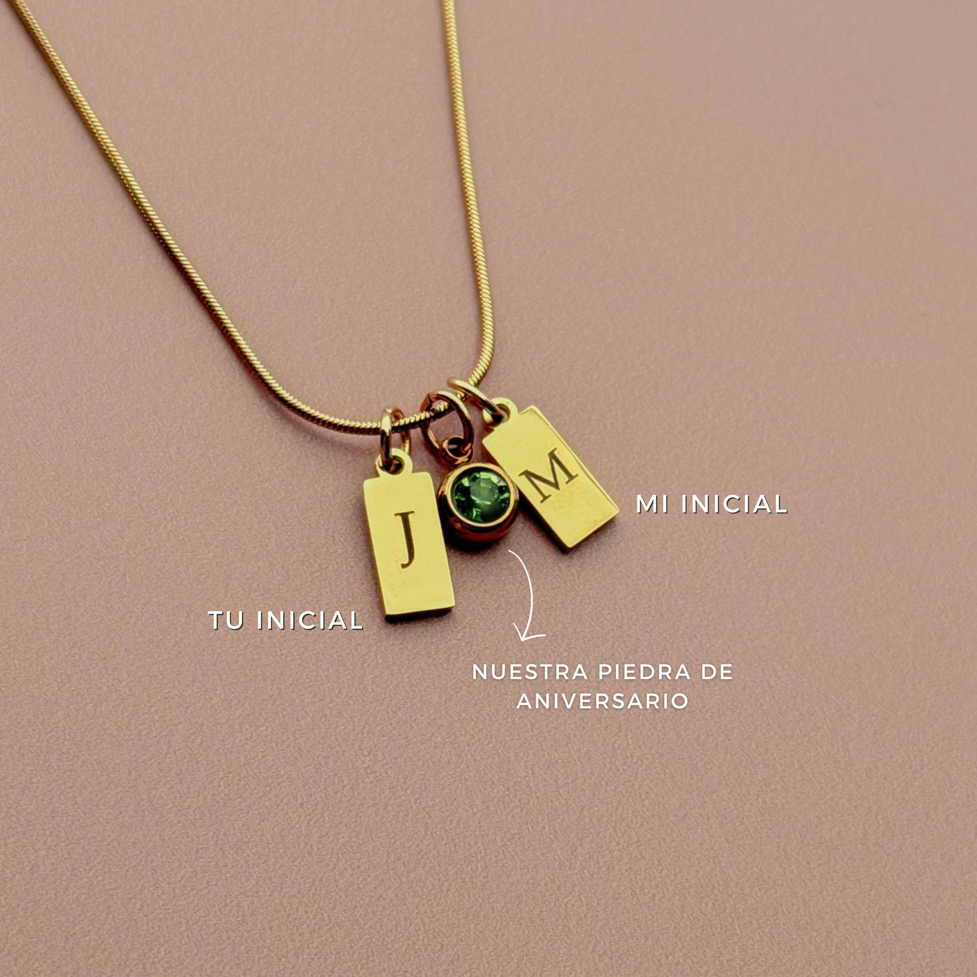 Elige tu piedra de acuerdo a la fecha de aniversario, el collar es de acero inoxidable puedes grabar dos iniciales o dos números en cada placa.