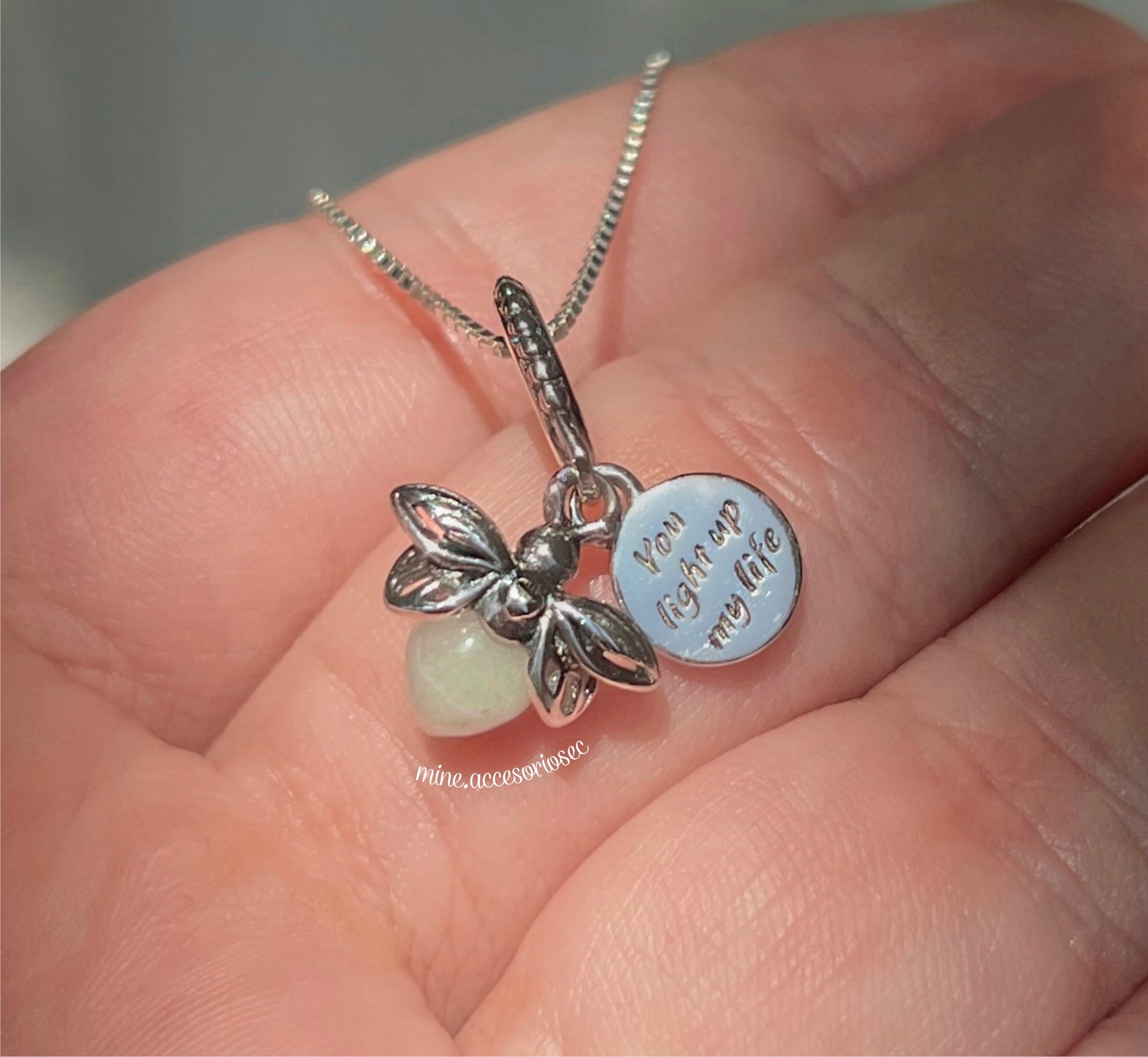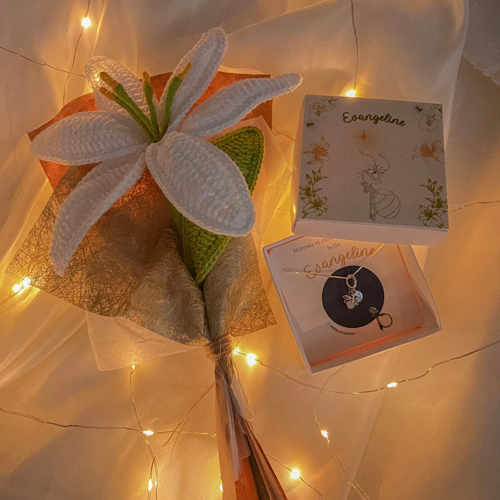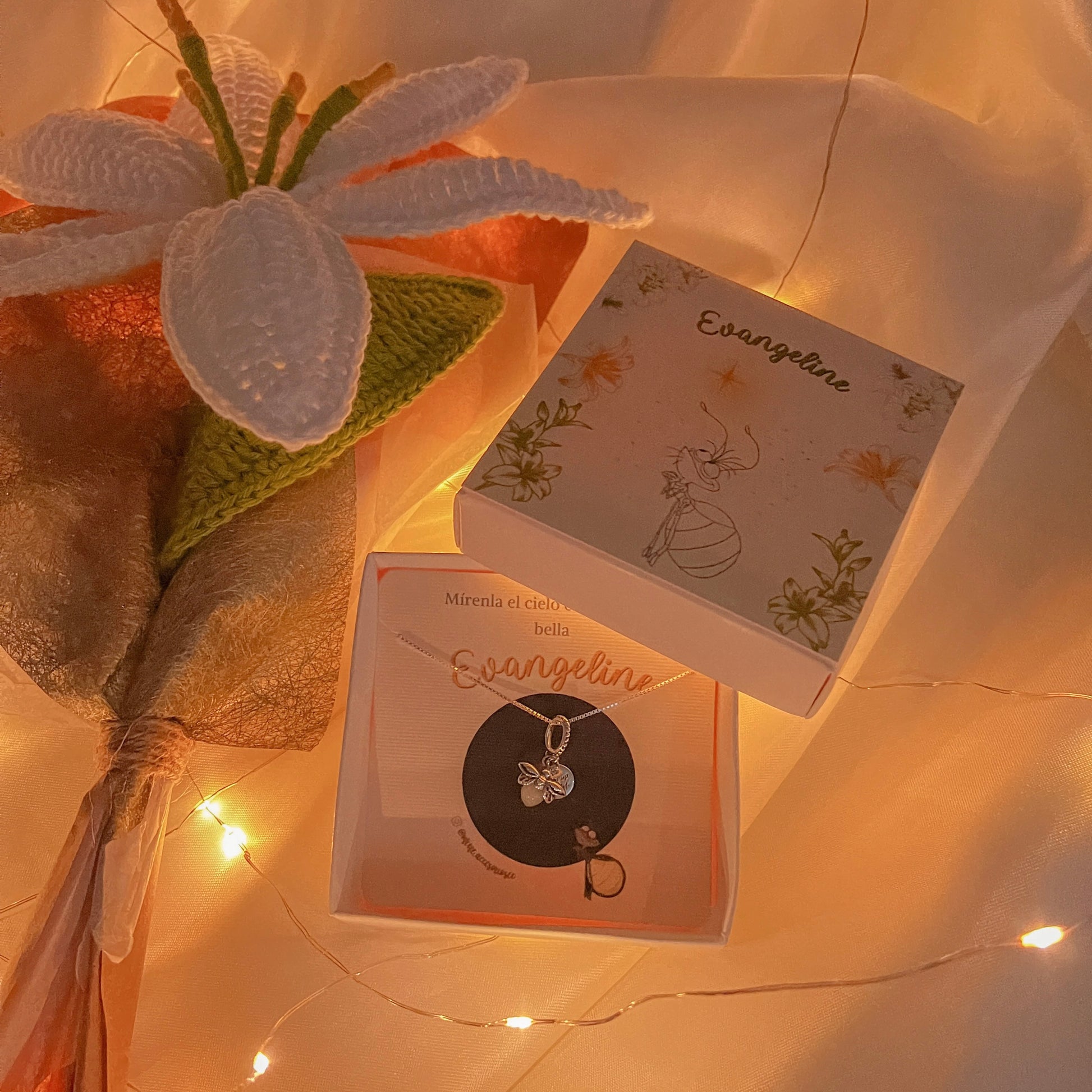 Incluye una flor tejida, un collar evangeline de plata 925 y caja con luces